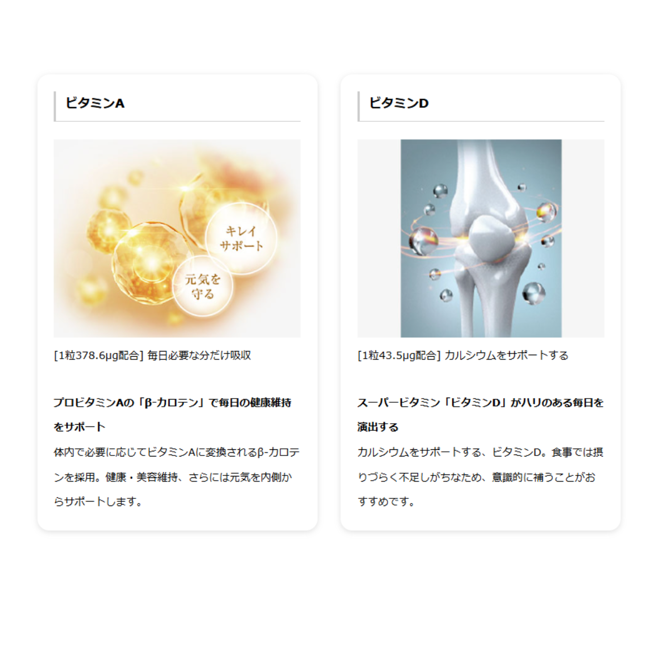 …肌や体の健康維持に必要なビタミン。必要な分だけビタミン A に変換されるプロビタミン A であるβ-カロテンとして配合。