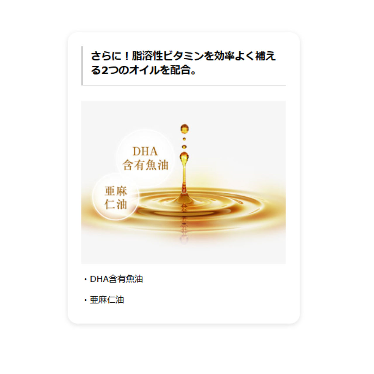 脂溶性ビタミン4種と共に相性の良い、HMB カルシウムや亜麻仁油、DHA 含有の魚油を配合。