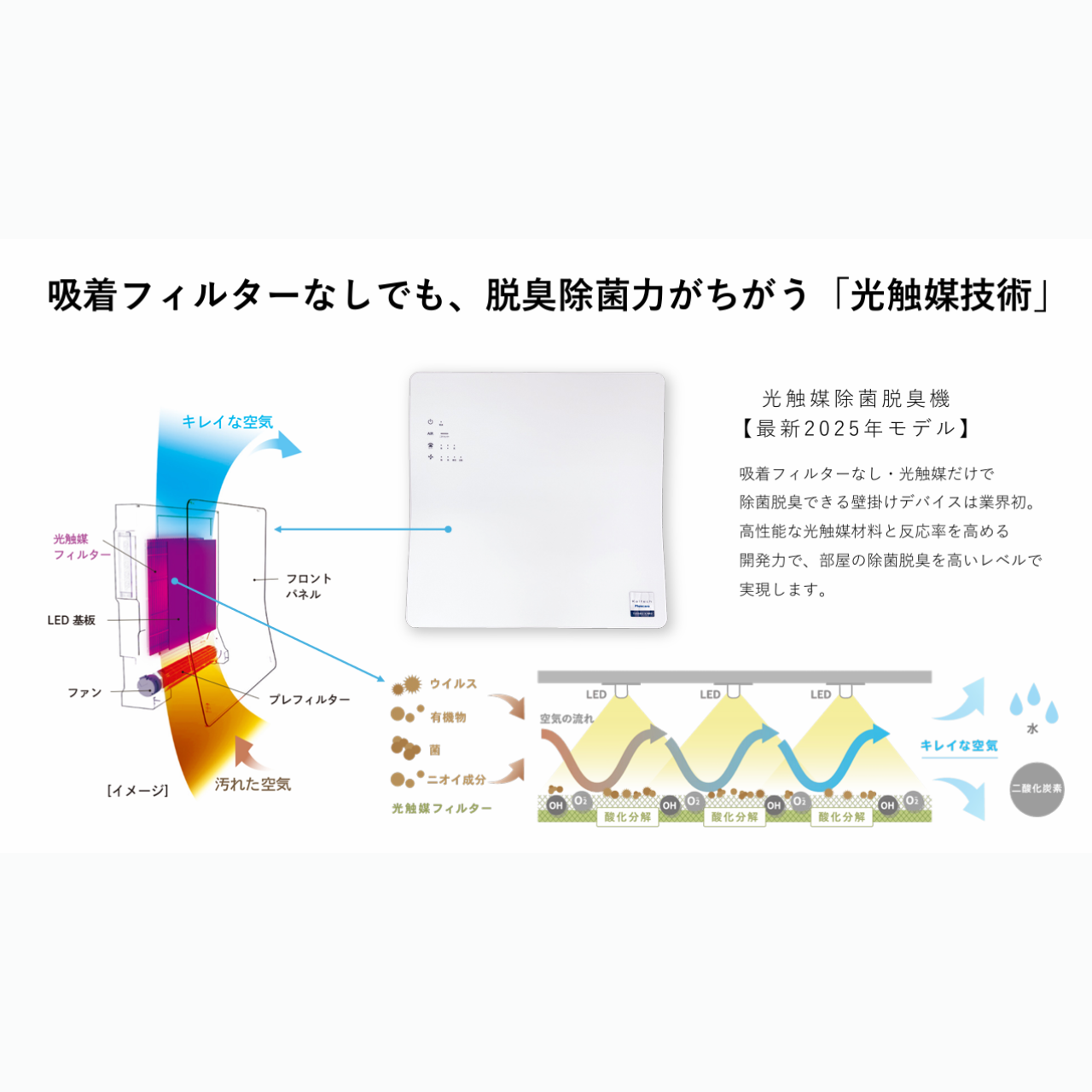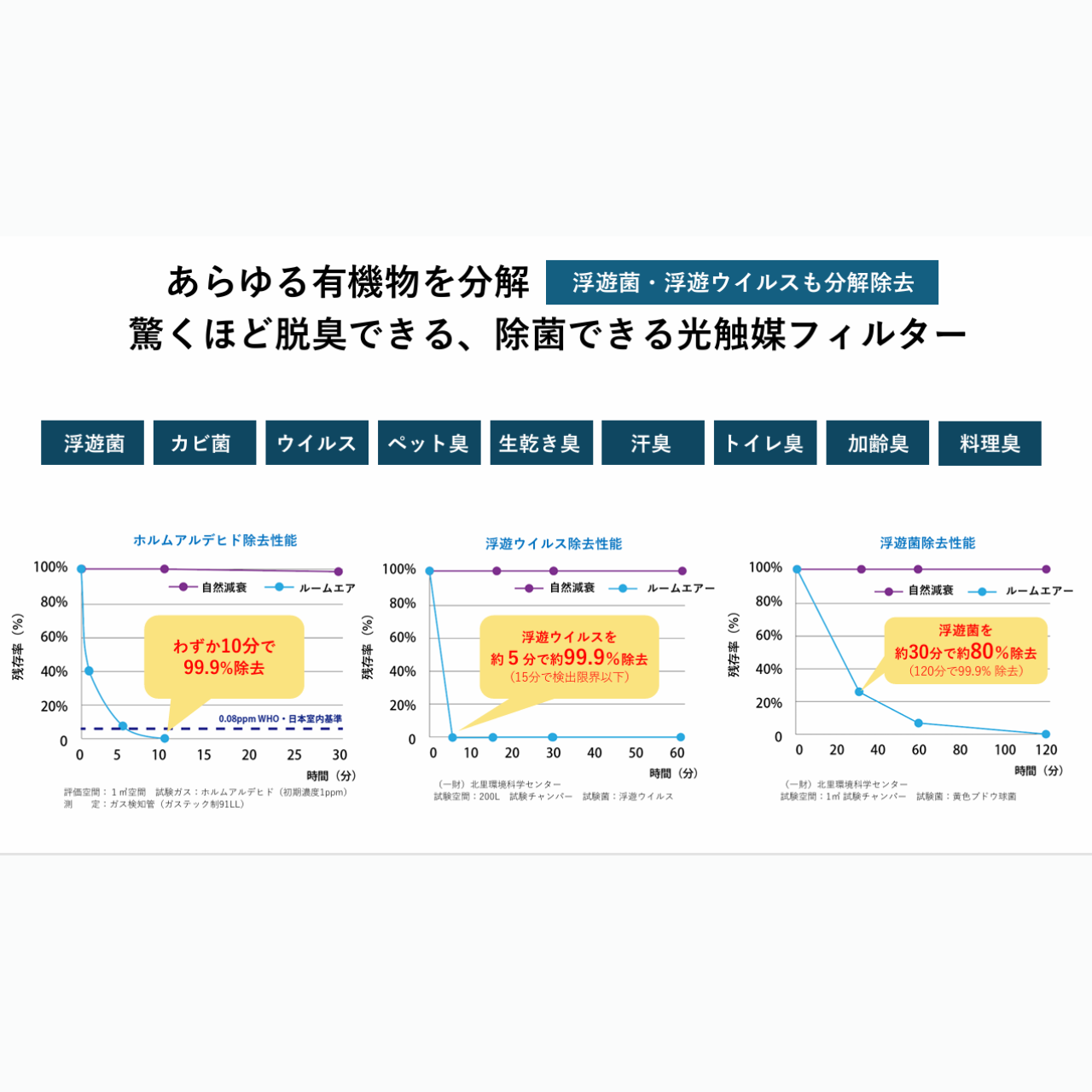 パーソナルスペースだけではなくお部屋丸ごと除菌脱臭できる「ルームエアー」は病院内で行われた実験で、菌やウイルスを分解除去することで院内感染数を激減させ、医師からもお墨付きをいただいたエビデンスのある光触媒技術を搭載しています。