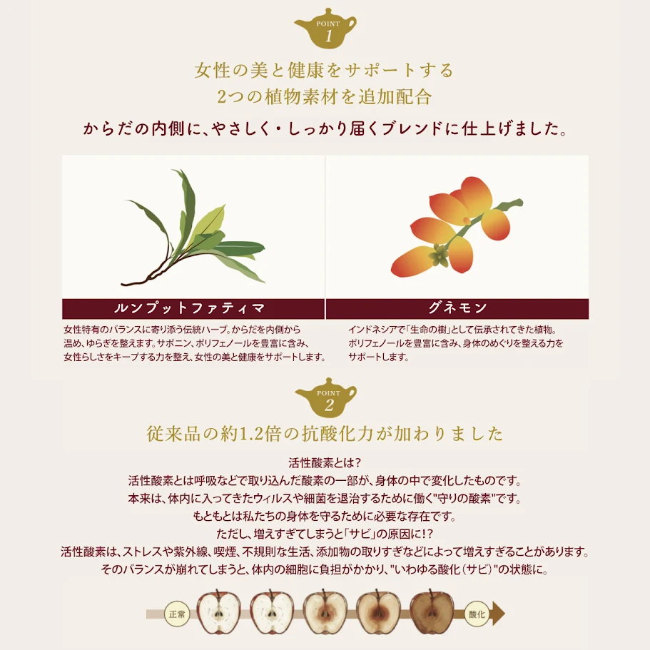 抗酸化能が高いことで知られるビタミンやポリフェノールの含有量が多く、毎日発生する活性酸素を抗酸化の力で撃退します。1gで250,000単位の活性酸素を除去する抗酸化力があり、その力はなんと緑茶の約40倍、ルイボスティーの約16倍あります。